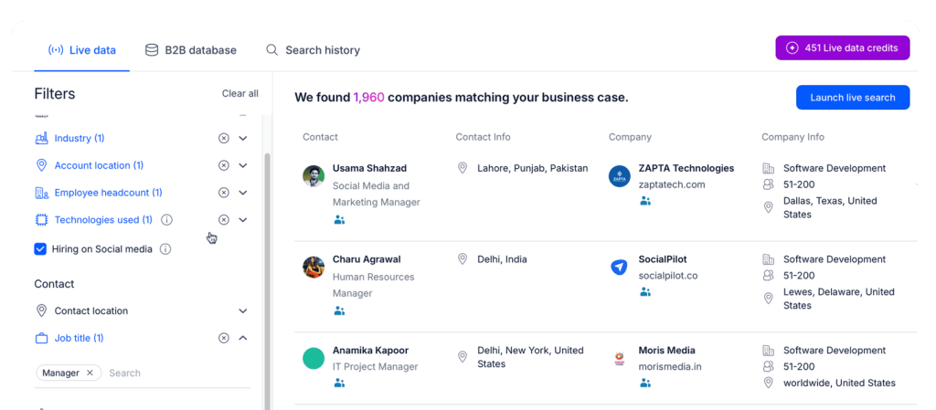 That’s why the first step is always to define your ideal customer profile (ICP) — company size, industry, tech stack, hiring activity, and then continue to filter ruthlessly.