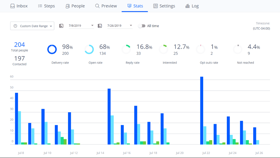 Detailed analytics into the performance of your email outreach (as well as other channels, including LinkedIn, messengers, and more), clearly showing delivery, open, reply, and click-through rates in real time for each recipient: